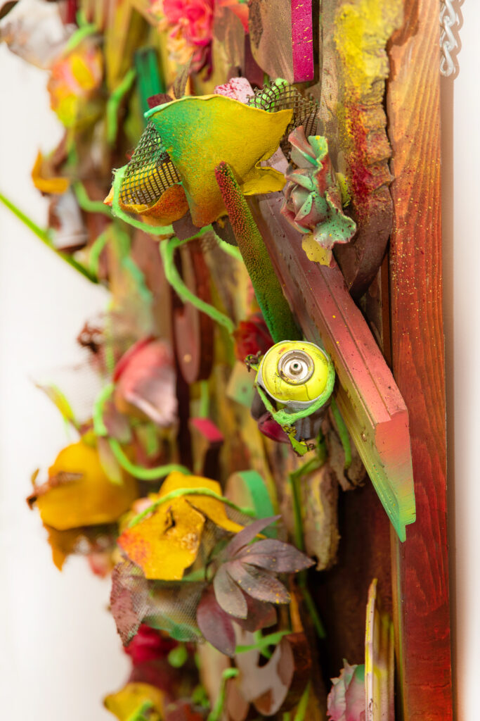 L’artiste expérimente le végétal avec la rencontre d’un univers brut, comme une friche industrielle que la nature tenterait de se réappropriéer. Il n’aime pas les limites extérieures d’un tableau… il aime sortir et déborder du cadre pour retrouver la liberté et l’énergie de l’espace urbain.