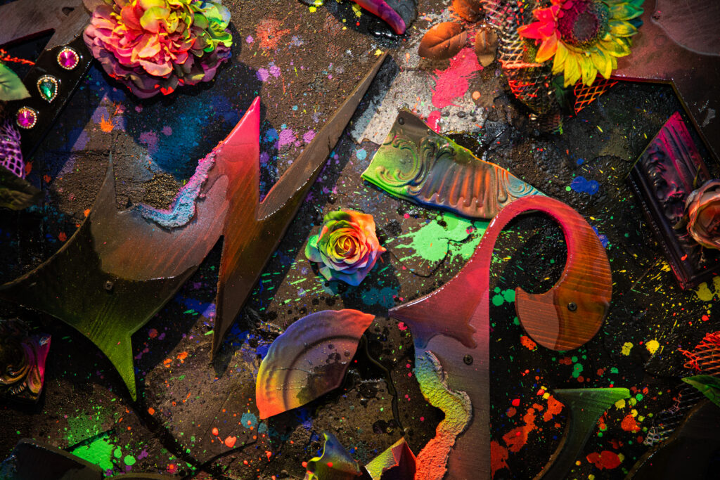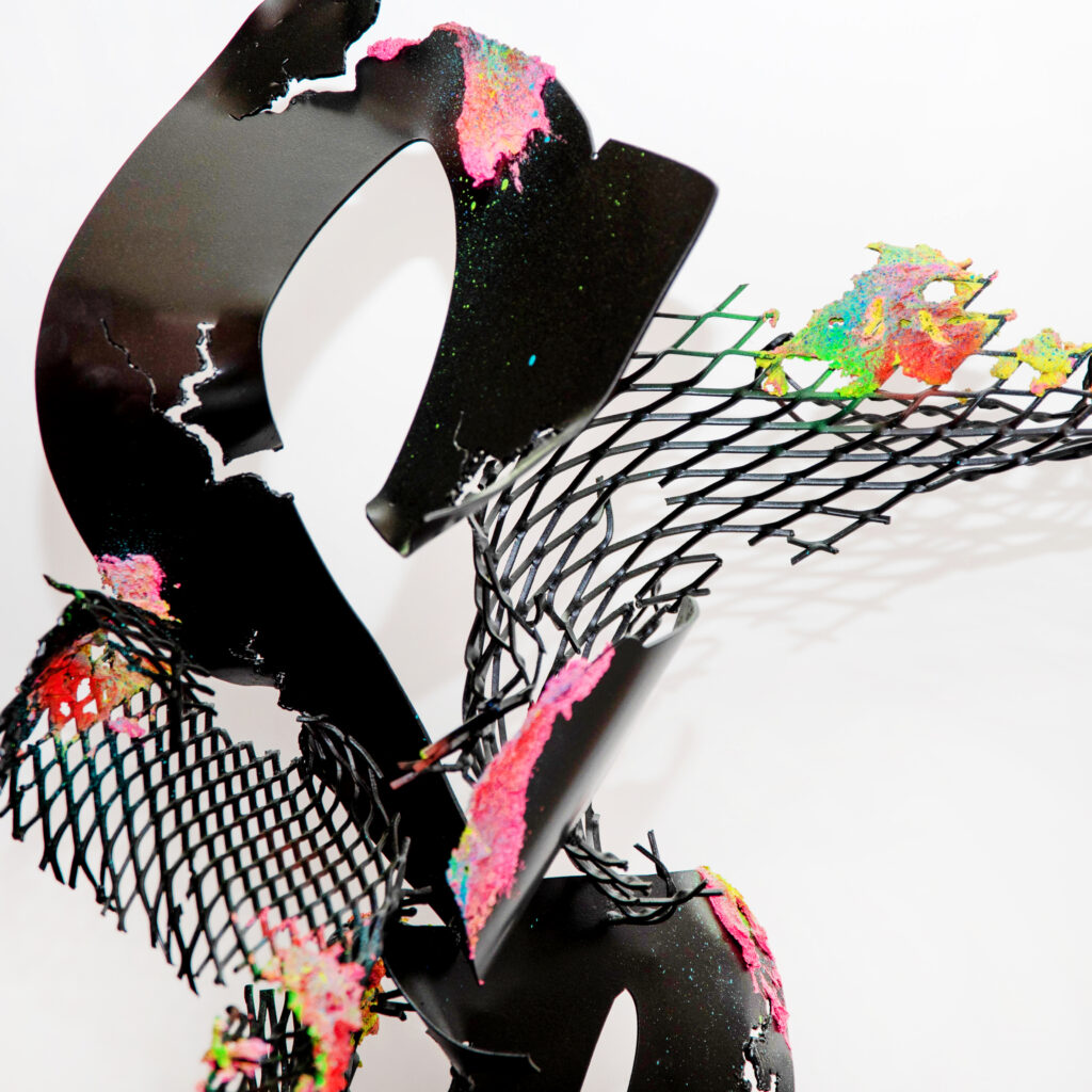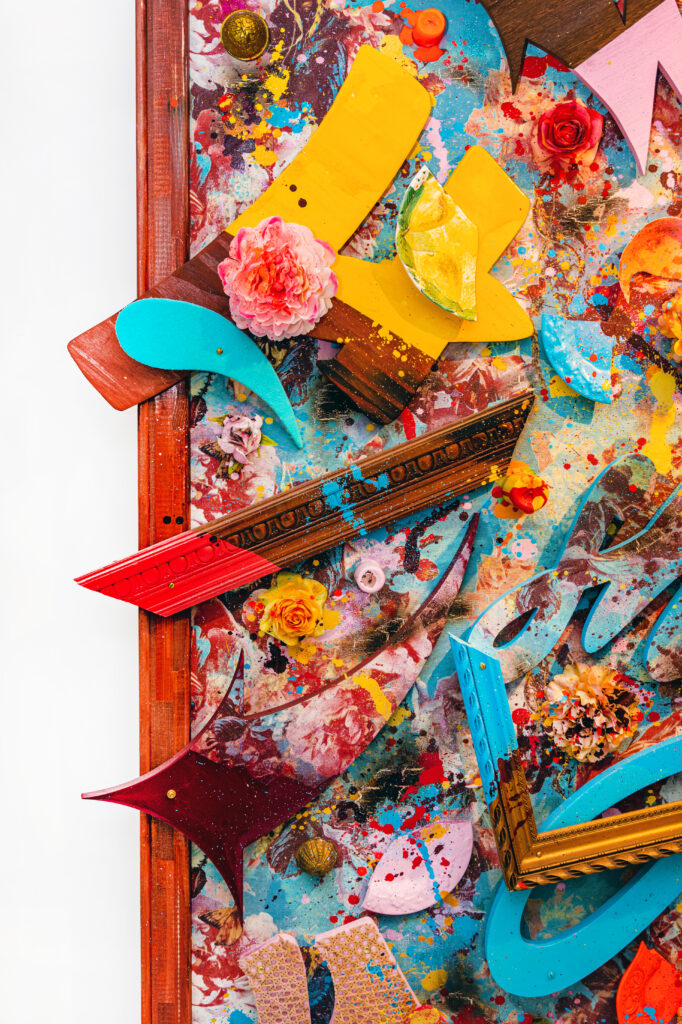 Fasciné par le travail de la lettre, essence même du graffiti traditionnel des années 70 au États Unis, il l’utilise comme support dans ses oeuvres en les déclinant en de multiples matériaux et techniques. La mixité de matière est la recherche perpétuelle du plasticien dans ses créations. Il déniche toute sorte d’objets leurs donnant une seconde vie, comme la Moulure d’une corniche trouvé sur un chantier, la laine d’un fauteuil fraîchement rénové, une chute de métal, un papier peint d’éditeur, une soupière rococo, de vieux smaltis vénitiens ramenés d’un voyage à Murano… Il aime également cumuler dans son art, la céramique, un savoir que l’artiste à parcouru en formation ces dernières années…